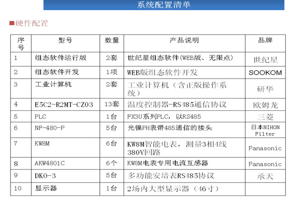 系統(tǒng)說明 l1.RS485總線來采集設(shè)備的各種參數(shù)。通過PLC與設(shè)備上的溫控表、PH值表、傳感器等以通信、 l2.使用工控組態(tài)軟件來存儲(chǔ)記錄PLC中采集的各種設(shè)備參數(shù)。 l3.使用KW8M 采集電流、電壓數(shù)據(jù)通過RS485通信。 l4.世紀(jì)星監(jiān)控系統(tǒng)控制策略的創(chuàng)建是在策略編輯器中實(shí)現(xiàn)的,策略編輯器是一個(gè)基于圖標(biāo),即功能模塊的設(shè)計(jì)環(huán)境.結(jié)合策略工具箱中的功能模塊及其相應(yīng)的參數(shù)配置對(duì)話框開發(fā)策略與配置工作.通過RS485總線通信采集數(shù)據(jù)連接功能塊。功能模塊也稱為軟儀表,其功能與人們熟悉的模擬儀表相同,能完成現(xiàn)場(chǎng)數(shù)據(jù)的采集、處理、顯示、報(bào)警和控制等(如溫度、電流、電壓、PH值、I/O狀態(tài)).構(gòu)建控制策略時(shí),用連線將策略所需的功能模塊連接起來. l5.采集的記錄報(bào)表數(shù)據(jù)發(fā)送到局域網(wǎng)外遠(yuǎn)端,在遠(yuǎn)端也能進(jìn)行數(shù)據(jù)分析。